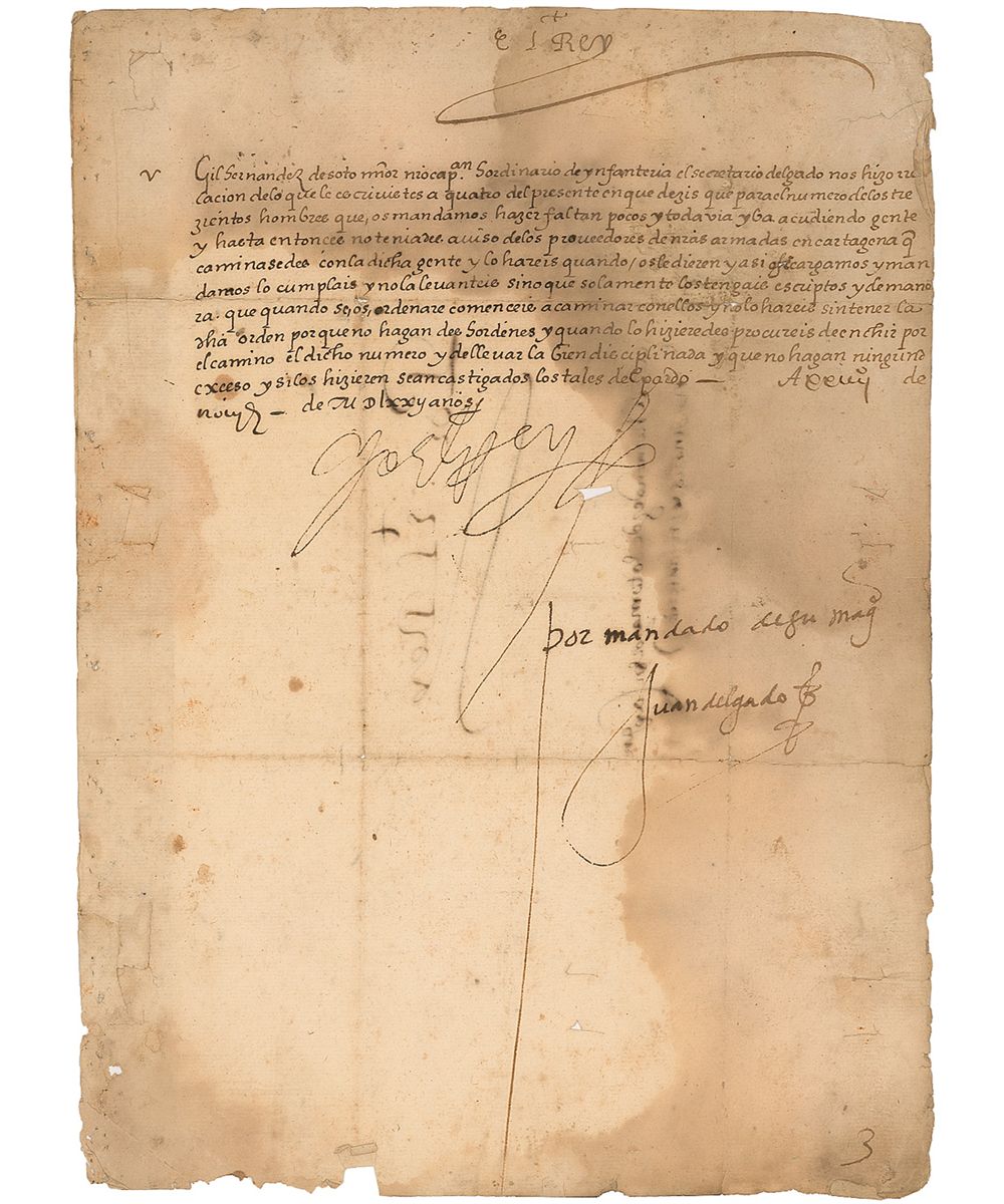 King of Spain, Portugal, Naples, Sicily, and, while married to Mary I, King of England and Ireland (born in 1527) who reigned between 1556 and 1598. Manuscript LS, in Spanish, signed “Yo El Rey,” (I the King), one page, 8.5 x 11.75, November 26th 1571. Written to Gil Hernandez de Sotomayor, regarding sending more troops to Cartagena to avoid disorders, signed at the conclusion by the king and countersigned by Juan Delgado. Reverse bears an address panel in the same hand as the text. In good condition, with intersecting folds, a few small areas of paper loss, with one to final letter of signature, moderate toning and dampstaining, marginal binding holes to left edge, and chips to edges.