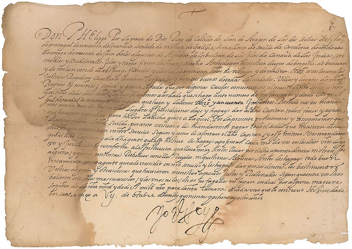 King of Spain (born 1527) from 1556 until his death in 1598; his eventful reign included Spain’s conquest of the Philippines (named for him), the establishment of a colony in Florida, and the historic defeat of the Spanish Armada by the British in 1588. Manuscript DS, in Spanish, signed “Yo El Rey,” one page, 12 x 8.5, October 7, 1588. Untranslated document in Spanish. Moderate to heavy overall dampstaining, not affecting the bold signature, and small chips and tears to edges, otherwise very good condition.