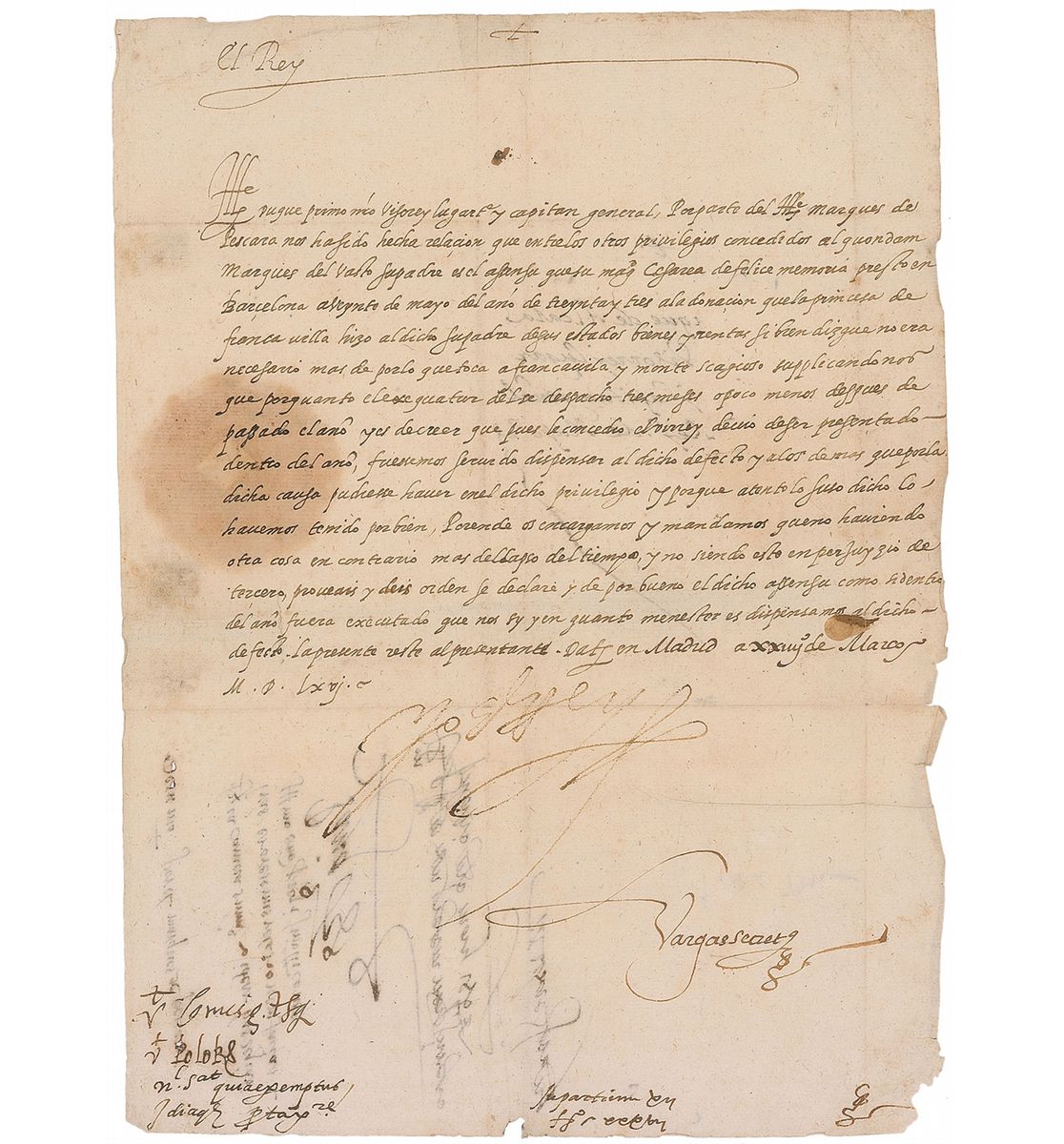 King of Spain (born 1527) from 1556 until his death in 1598; his eventful reign included Spain’s conquest of the Philippines, the establishment of a colony in Florida, and the historic defeat of the Spanish Armada by the British in 1588. LS in Spanish, signed “Yo el Rey,” one page, 8.5 x 11.5, March 28, 1566. Untranslated letter to Pedro Afan, who served variously as Viceroy of Naples, Viceroy of Cataluna, and 1st Duke of Alcala de los Gazules, concerning the Marques of Pescara and the Princess of Francavila. In very good condition, with intersecting folds, scattered creases, an area of circular toning, and some show-through from docketing to reverse.