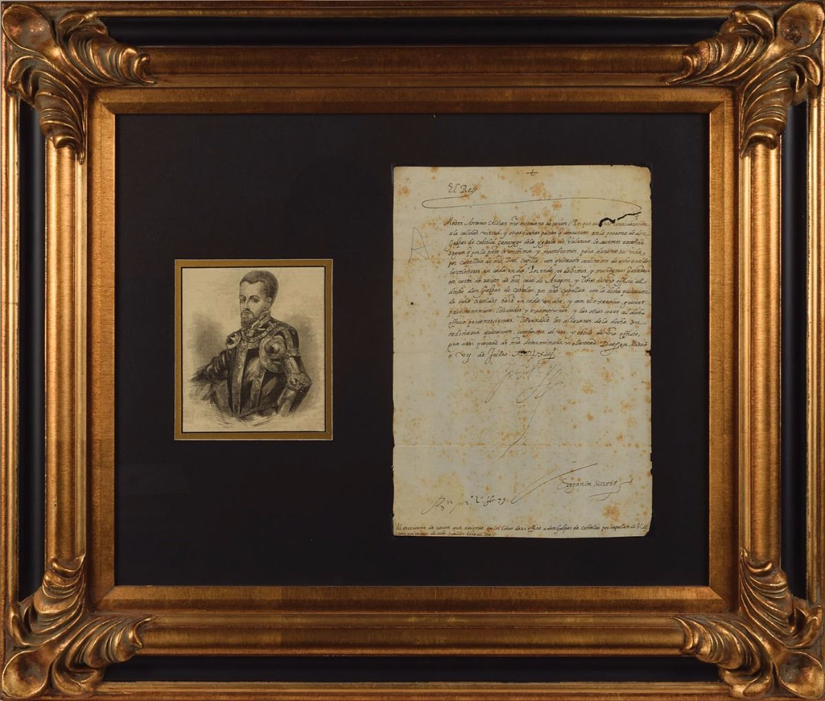 King of Spain (born 1527) from 1556 until his death in 1598, whose his eventful reign included Spain's conquest of the Philippines (named for him), the establishment of a colony in Florida, and the infamous defeat of the Spanish Armada by the British in 1588. Manuscript DS in Spanish, signed “Yo El Rey,” one page, 8.5 x 12.25, July 15, 1564. Document issued to Paymaster Mossen Antonio Celdran, to grant Don Gaspar de Castelin, Canon of the Church in Valence, the post of Chaplin to the Royal Chapel, "at a current salary of eight Barcelonan…per day." Ornately matted and framed with an engraved portrait to an overall size of 27 x 23. In very good condition, with moderate overall foxing.