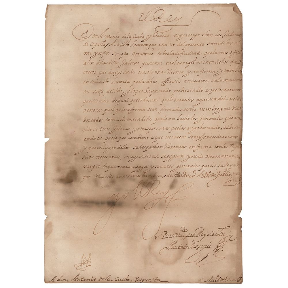 Untranslated manuscript DS in Spanish, signed “Yo el Rey,†one page, 8.25 x 11.75, July 31, 1621. Signed at the conclusion by the 16-year-old king. In very good to fine condition, with minor loss along the edges, and some staining affecting appearance. Philip ascended the throne only four months prior, making this a particularly early example.