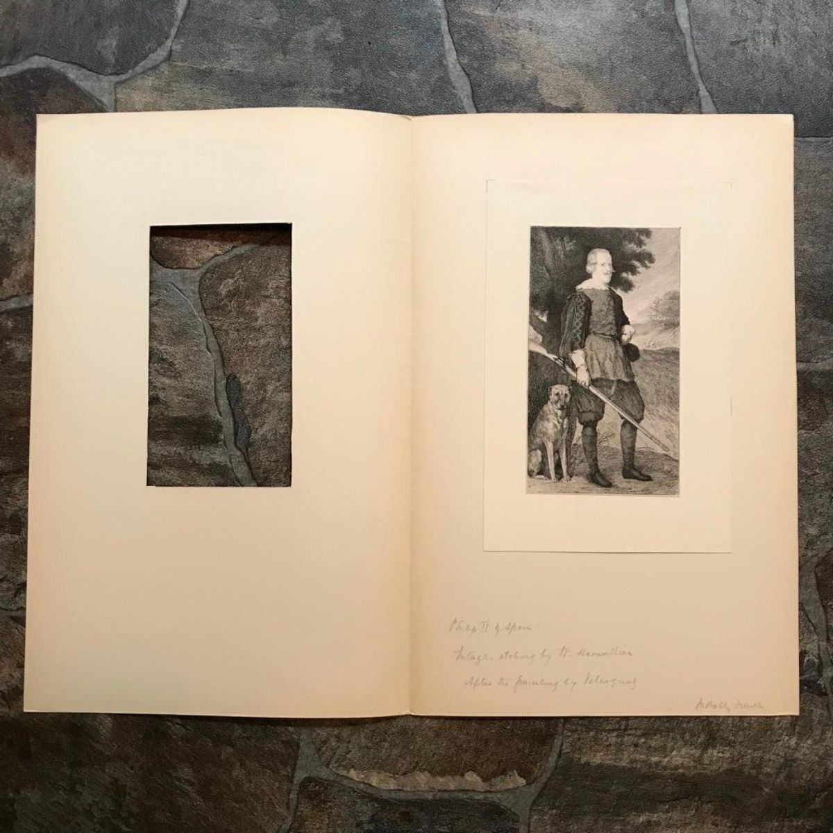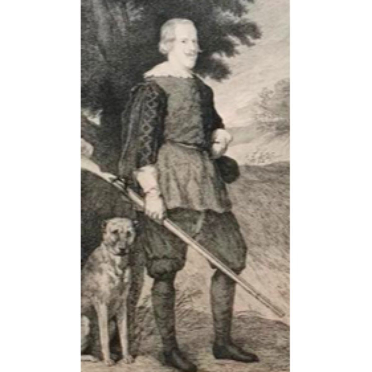 19thc French intaglio etching, after the original 17thc hunting portrait of King Philip IV of Spain by Diego Velazquez. 7" X 11" in 11 1/4" X 17 1/2" folio. Â