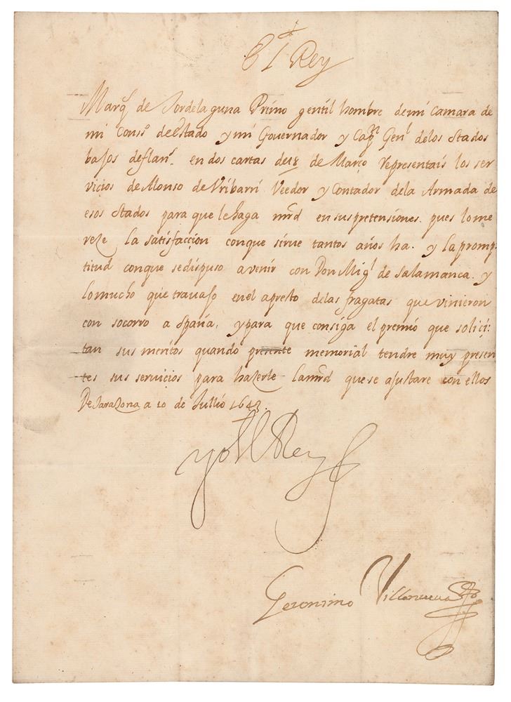Manuscript DS in Spanish, signed "Yo El Rey," one page, 8.25 x 11.5, July 10, 1643. Untranslated letter to the Marquis of Tordelaguna, giving instructions to the governor of Flanders, which was under Spanish domain at the time. Prominently signed at the conclusion by King Philip IV of Spain. In fine condition.