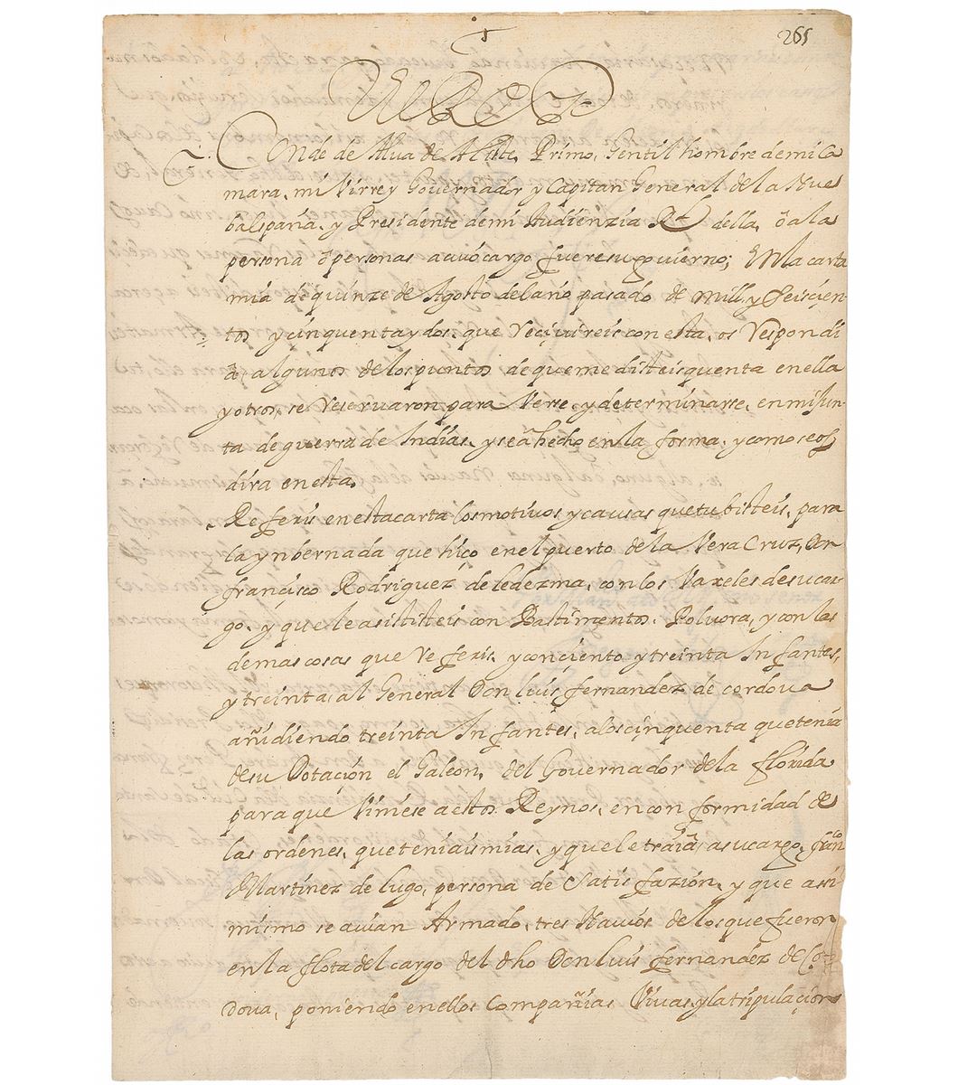 King of Spain (1605–1665) who reigned from 1621 until his death. LS in Spanish, signed “Yo el Rey,” three pages on two adjoining sheets, 8.25 x 12, March 19, 1653. Untranslated letter in which King Philip acknowledges receipt of the viceroy’s last letter-report and thanks him for his zeal and efficiency in royal service. In very good condition, with some chipping and small tears to edges, show-through from writing to opposing sides, and skipping to portions of the signature.