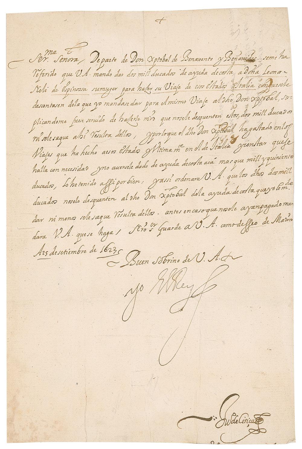 King of Spain (born in 1605) who reigned between 1621 and 1665. Manuscript DS, in Spanish, signed “yo El Rey (I the King),” one page, 7.75 x 11.5, September 25, 1623. Untranslated document signed at the conclusion by Philip. Document is affixed to an identical size sheet. In very good condition, with intersecting folds, scattered wrinkling and toning, and a lightly trimmed right edge.