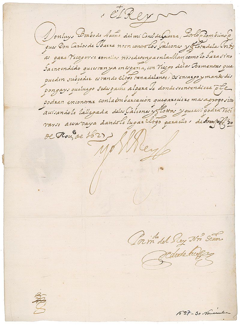 King of Spain (born in 1605) who reigned between 1621 and 1665. Manuscript DS, in Spanish, signed “Yo el Ray (I the King),” one page, 8.25 x 11.5, November 30, 1627. Untranslated document nicely signed at the conclusion by the King. Reverse of second integral page bears an address panel and a crisp paper and wax seal. Intersecting folds, one through a single letter of signature, some light wrinkling and creasing, and some slight surface loss to top of seal, otherwise fine condition.