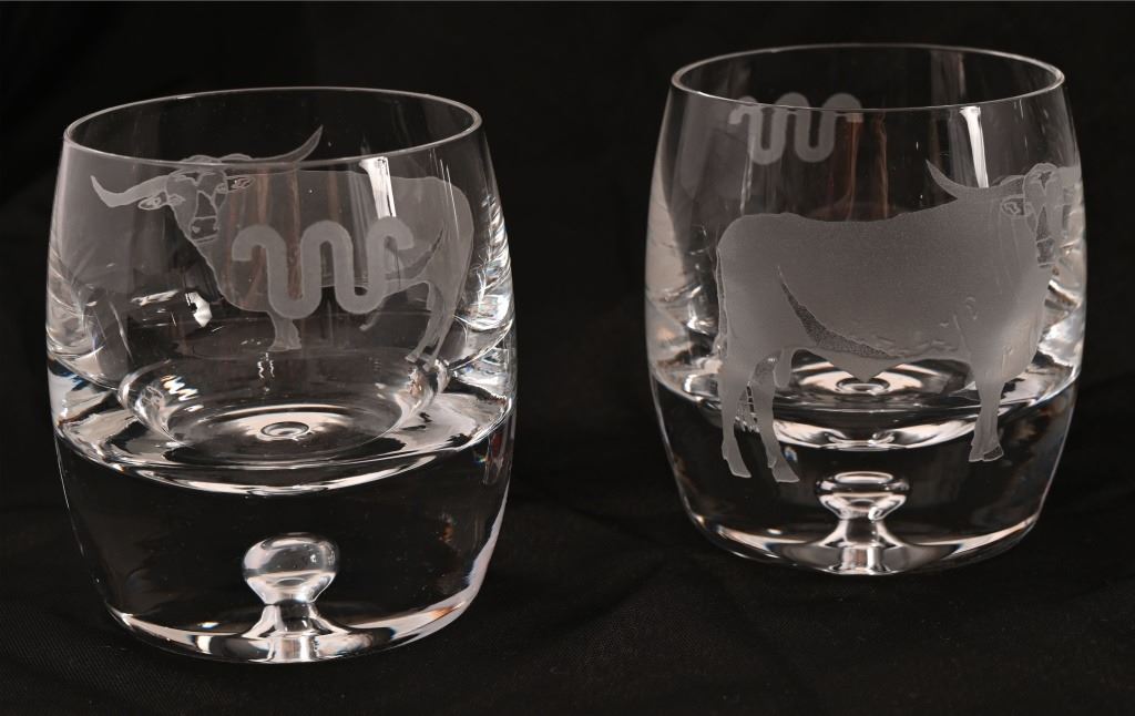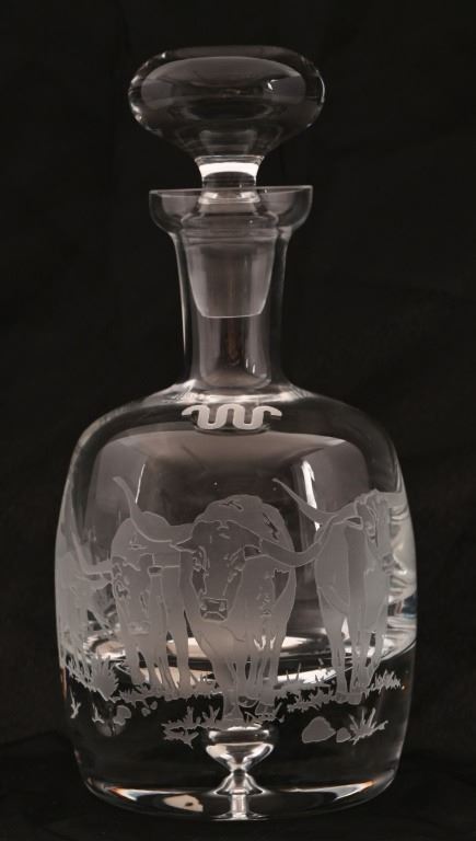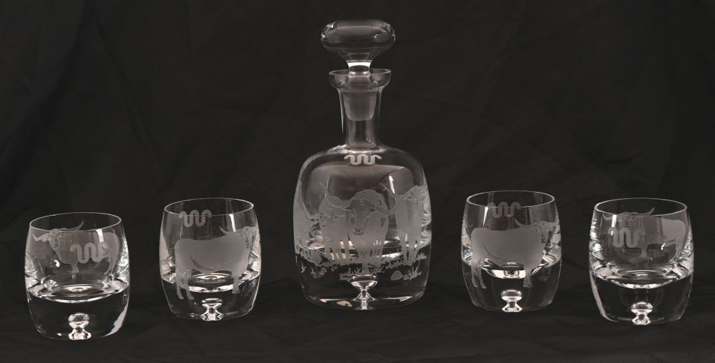 King Ranch crystal glass decanter set, with four (4) glasses. Pewter emblem Running W.