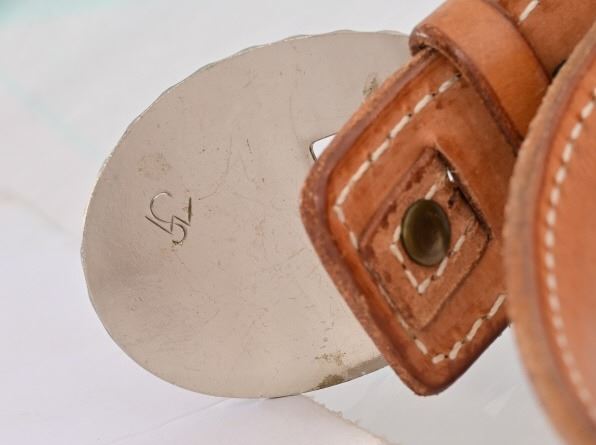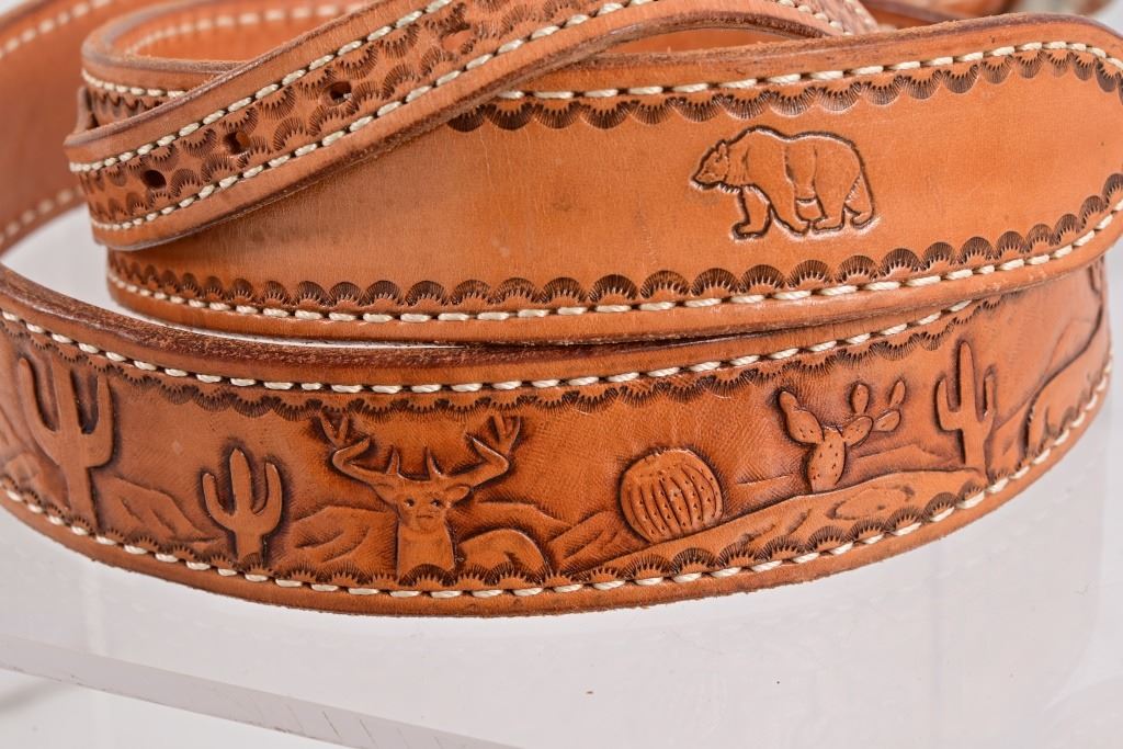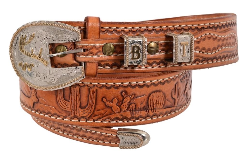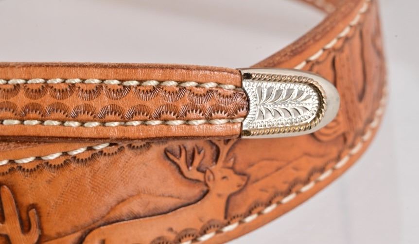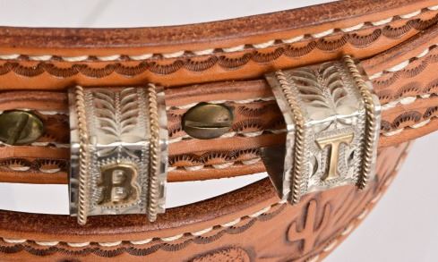 Relief engraved with King Ranch "Running W" brand. Gold and sterling inlayed buckle, stays, and end tip. Approx. 44" L.