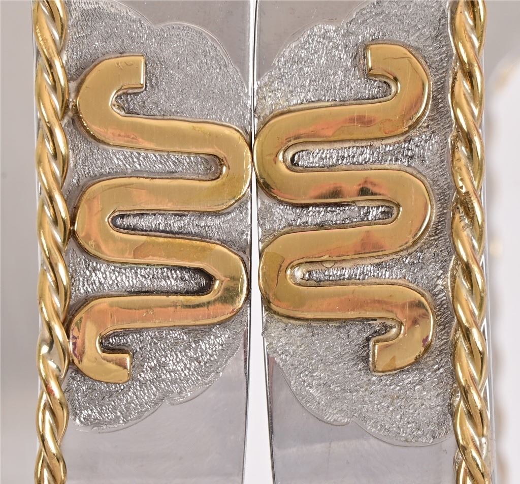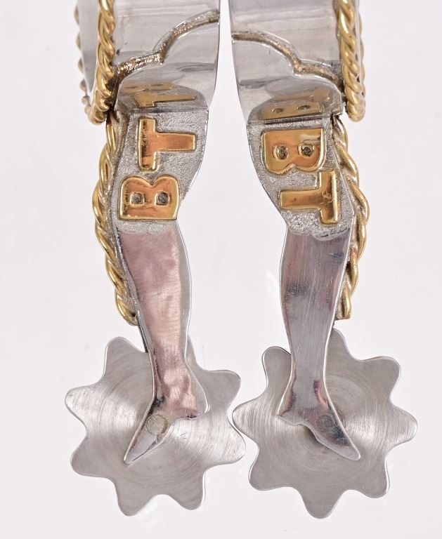 These spurs were given to event winners during the annual King Ranch Ranch Rodeo open to King Ranch cowboys (Kinenos) & share holders. This pair was won by Butch Thompson. King Ranch "Running W" brand, along with Butch Thompson's initials "BT" in gold overlay.
