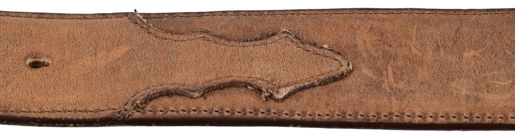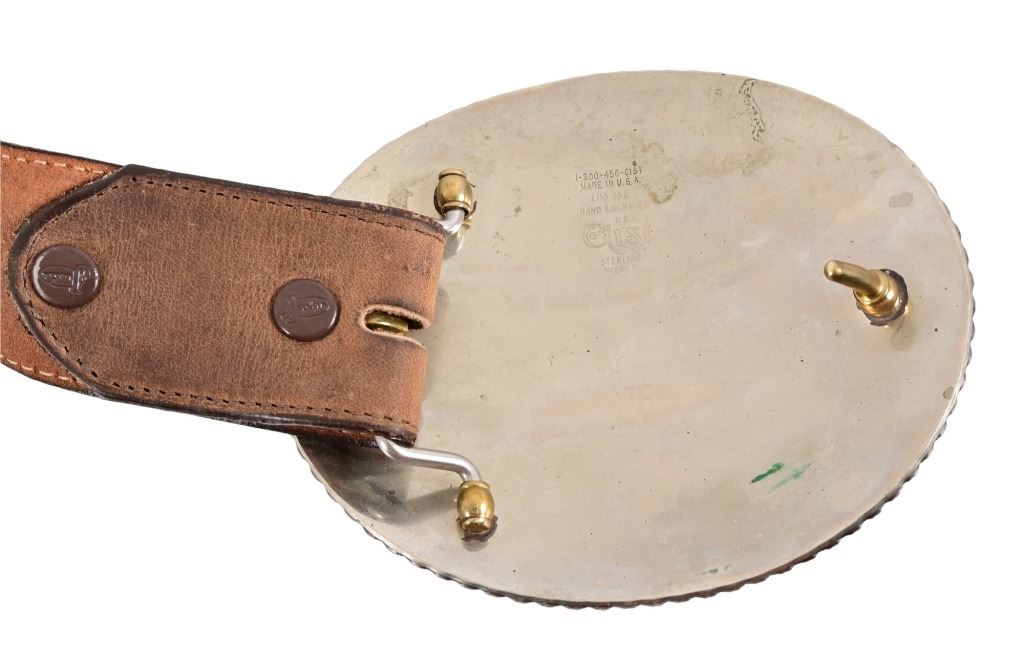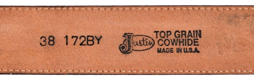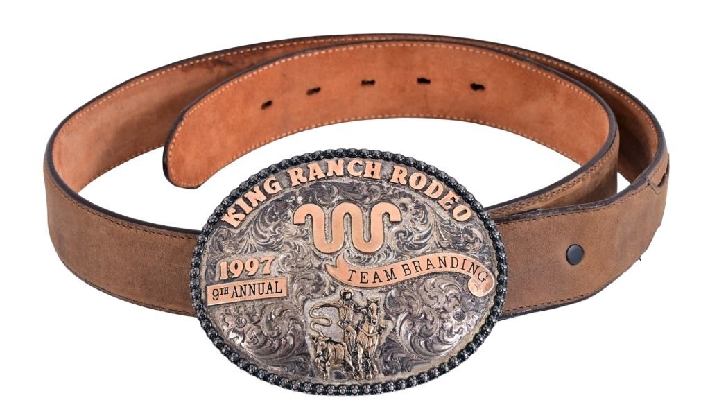 9th Annual (1997) King Ranch Rodeo Team Branding Belt Buckle with Justin genuine top grain cowhide belt. Buckle made in U.S.A. by Gilt 1/10 10K, hand-engraved, sterling overlay. Belt is a size 38.Won by Butch Thompson during the annual King Ranch Ranch Rodeo open to King Ranch cowboys (Kinenos) & share holders only.