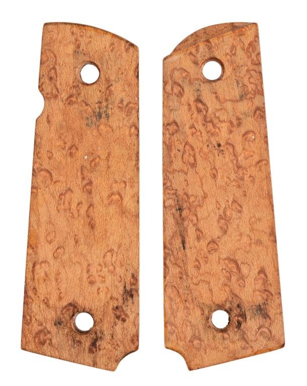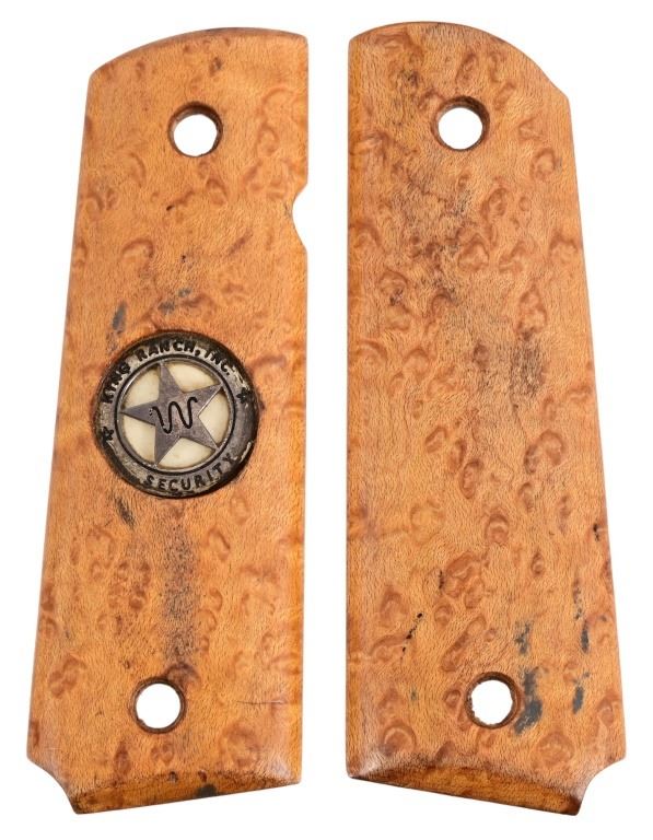 King Ranch Security "Running W" badge medallion set into bird's eye maple grips for full-size 1911.