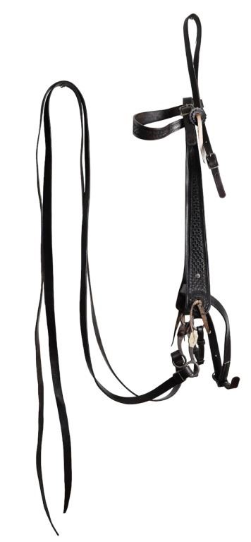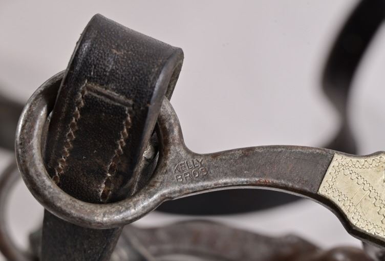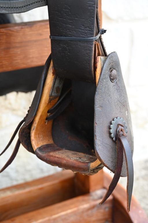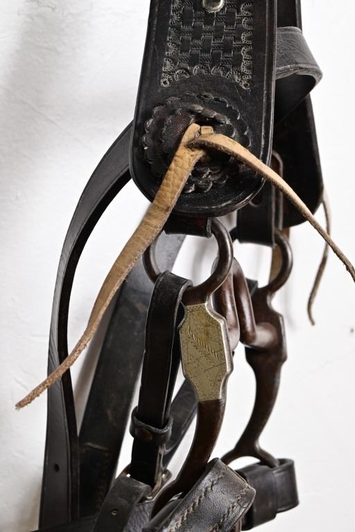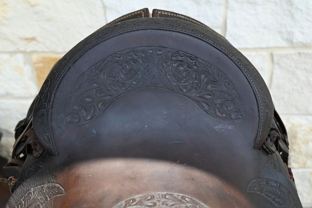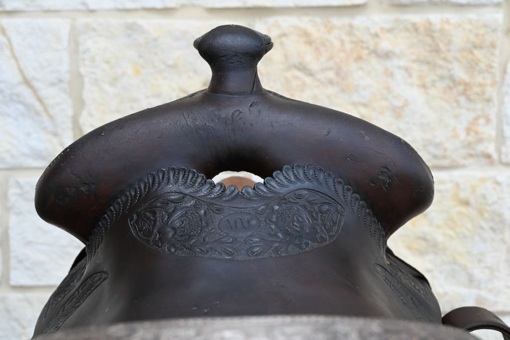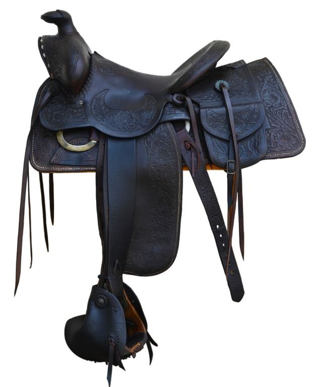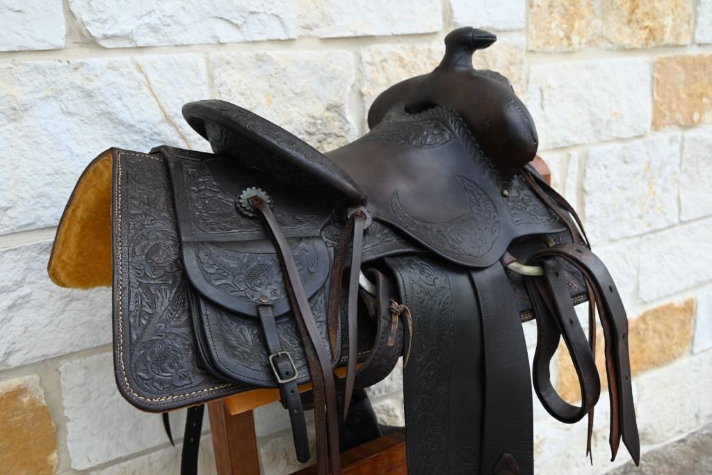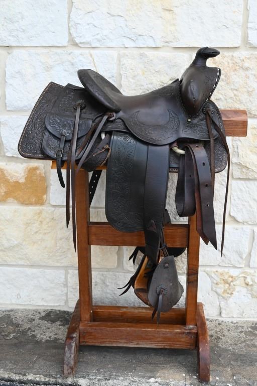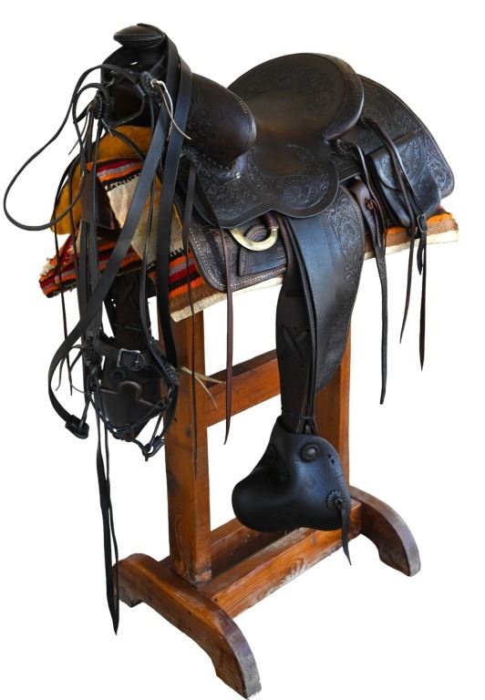Vintage leather saddle built by the King Ranch Saddle shop.. Features hand-tooled floral pattern, King Ranch and "Running W" marked, with Tapaderos. With Navajo Woven Saddle Blanket, 30.5" x 57.5" and Vintage Kelly Bros Silver Mounted Bit & Bridle Set. Includes custom made saddle stand.