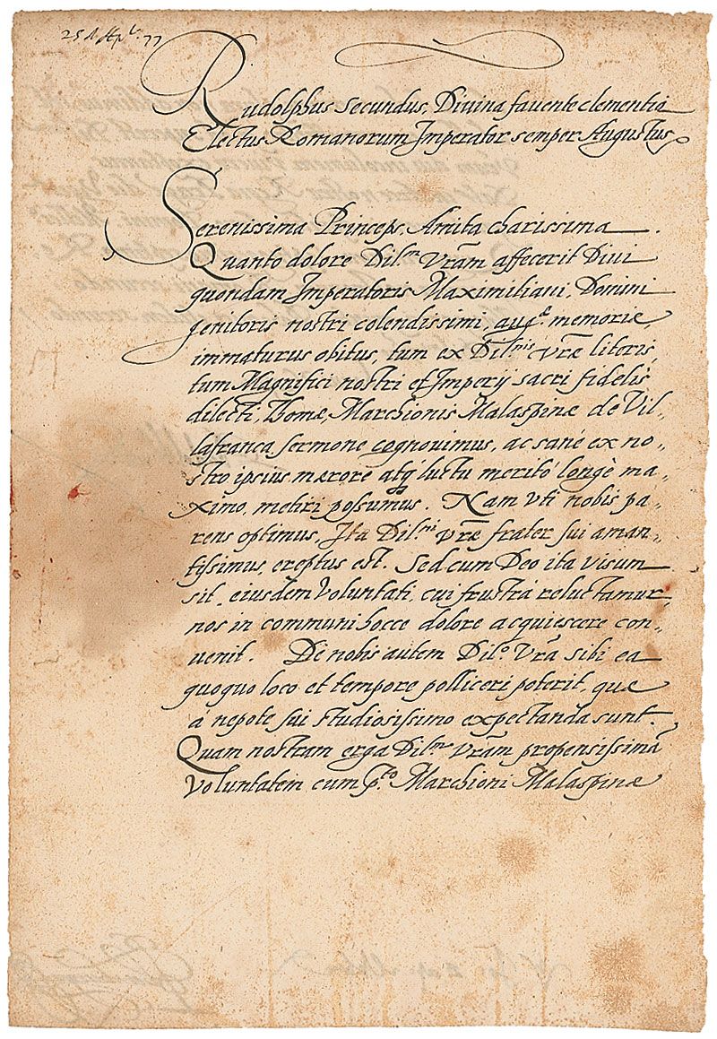 Member of the House of Habsburg who ruled as Holy Roman Emperor from 1576 until his death (1552–1612), remembered as an influential patron of the arts but ineffectual ruler whose mistakes led directly to the Thirty Years’ War. LS in Latin, signed “Rudolphus,” one page both sides, 8 x 12, 1577. Untranslated letter written from Prague, signed at the conclusion by Rudolf and by Secretary of Chancery Peter Obernburger. Intersecting folds and scattered foxing and staining (a circular area affecting a portion of his signature), otherwise fine condition.