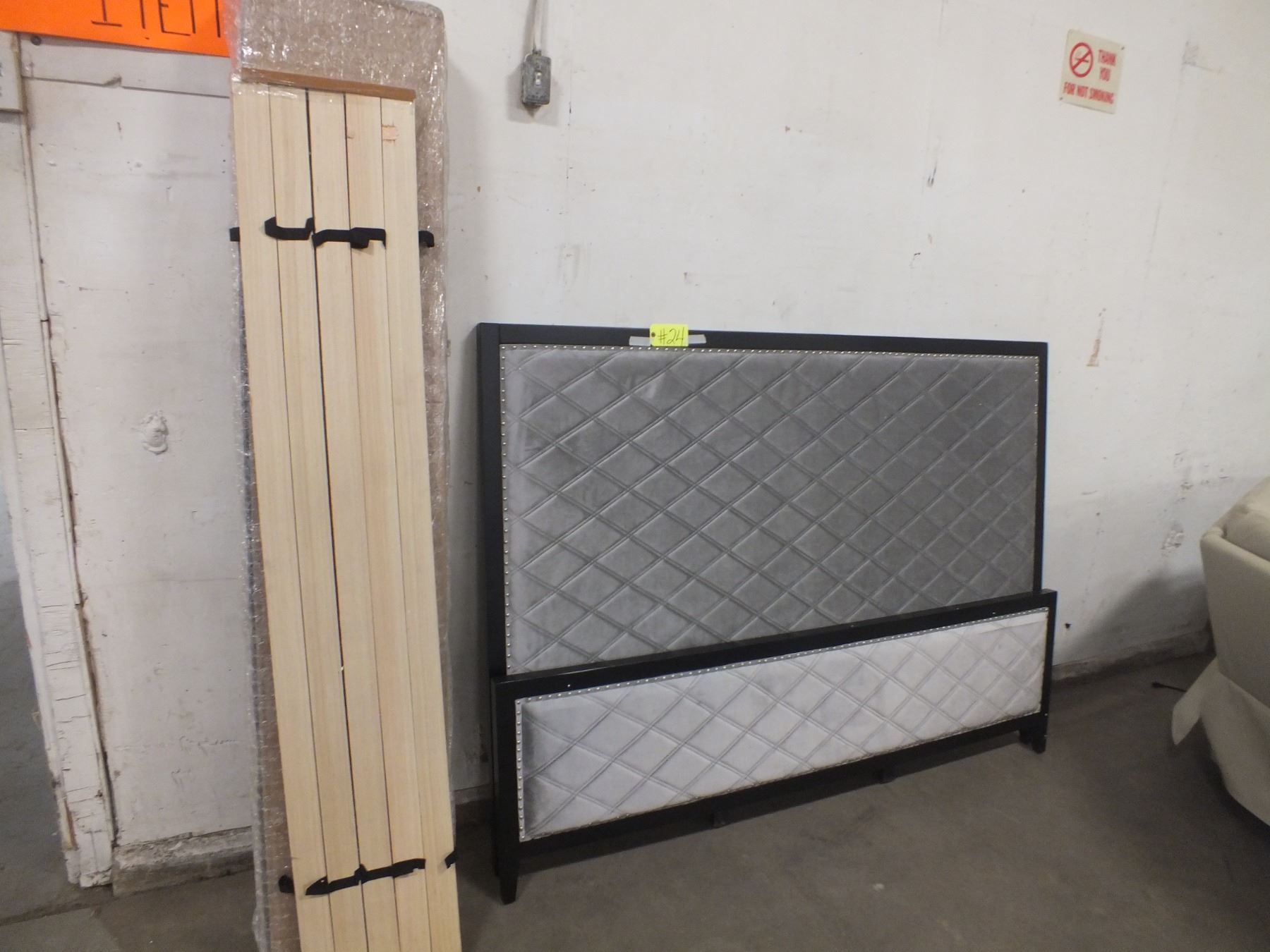 King Sized Bed Frame, you get the headboard, footboard and rails & slats, one leg has been repaired store returns...like new condition