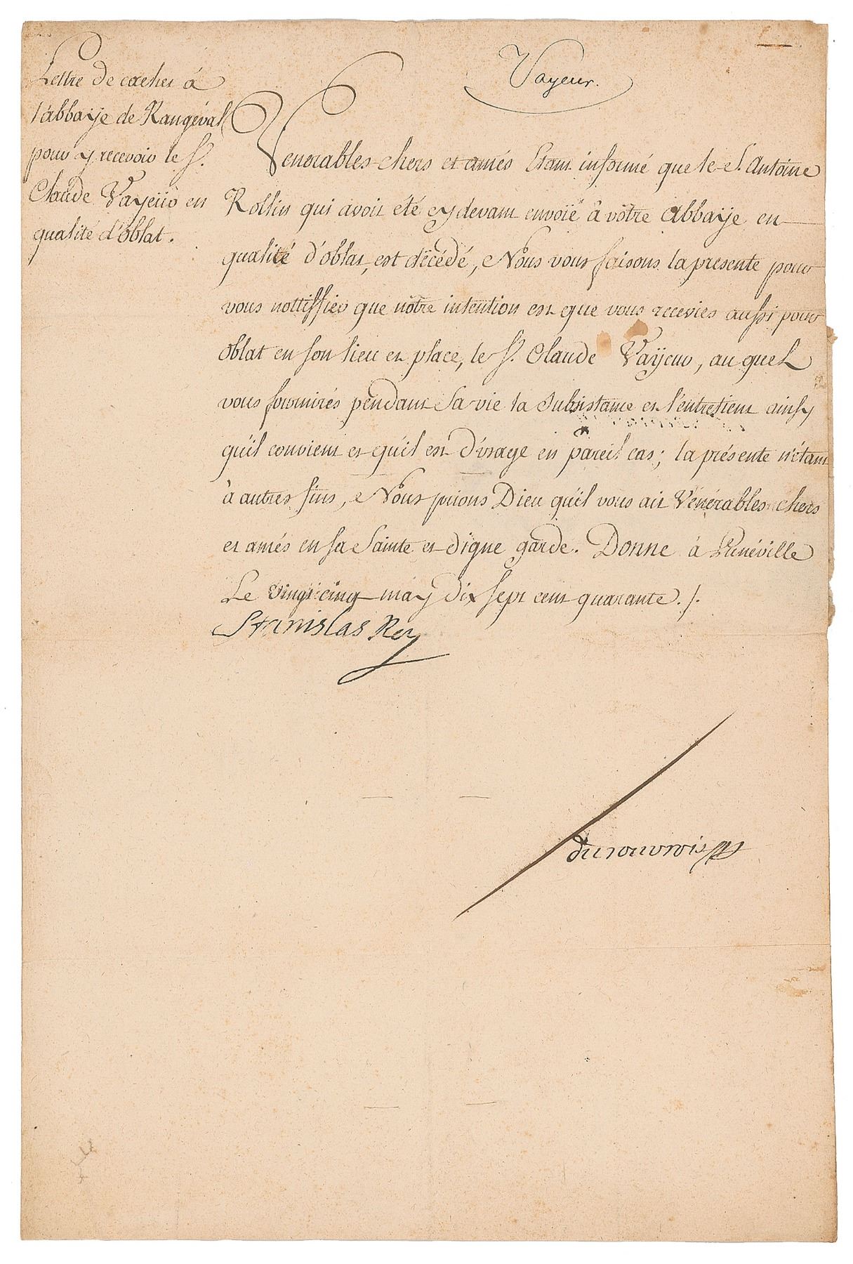 Manuscript DS in French, signed “Stanislas Rey,” one page, 8.75 x 13, May 25, 1740. Untranslated. In very good to fine condition, with light staining and creasing.