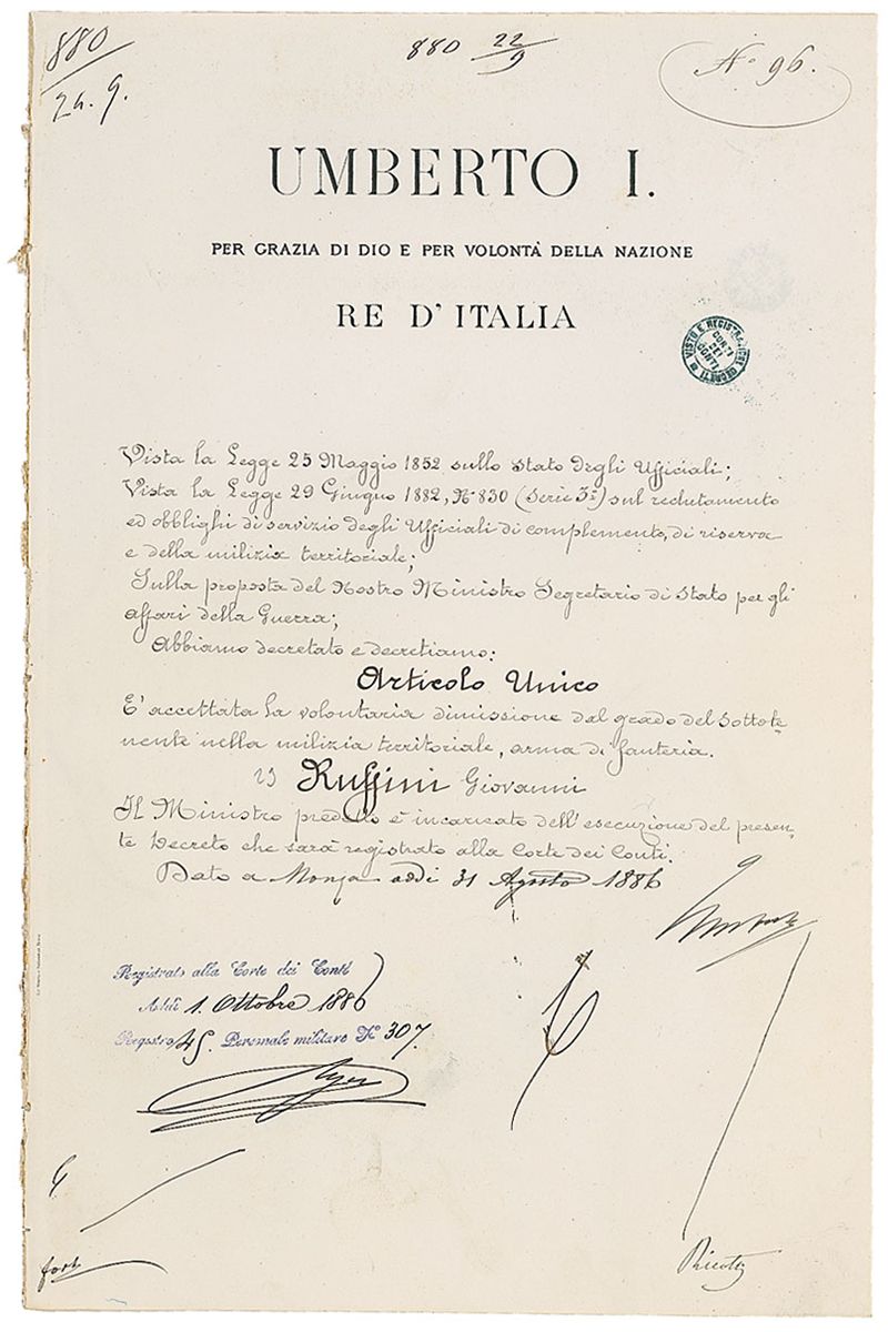 King of Italy (1844–1900) who reigned from 1878 until his assassination; he was the only Italian king to be assassinated in modern times. Untranslated manuscript DS in Italian, signed “Umberto,” one page, 9.5 x 14.75, August 31, 1886. In fine condition, with a few creases and expected document wear.