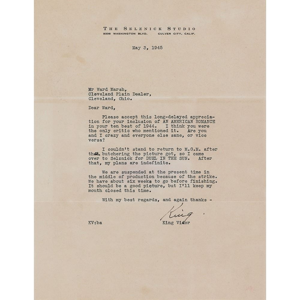 TLS signed “King,” one page, 8.5 x 11, The Selznick Studio letterhead, May 3, 1945. Letter to movie critic Ward March of the Cleveland Plain Dealer, thanking him for recognizing a recent film and explaining why he left M.G.M. In part: “Please accept this long-delayed appreciation for your inclusion of AN AMERICAN ROMANCE in your ten best of 1944. I think you were the only critic who mentioned it. Are you and I crazy and everyone else sane, or vice versa? I couldn’t stand to return to M.G.M. after the butchering the picture got, so I came over to Selznick for DUEL IN THE SUN. After that my plans are indefinite. We are suspended at the present time in the middle of production because of the strike. We have about six weeks to go before finishing. It should be a good picture, but I’ll keep my mouth closed this time.” In fine condition. Accompanied by the original mailing envelope.
