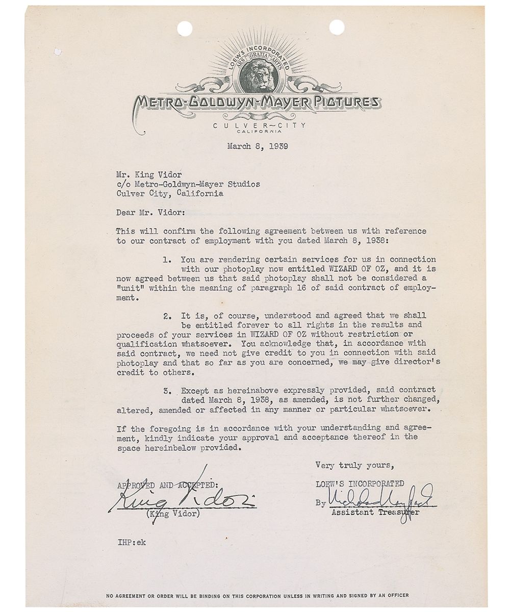 DS, one page, 8.25 x 10.75, March 8, 1939. Confirmation of Vidor’s agreement with MGM for the direction of The Wizard of Oz. In part: “You are rendering certain services for us in connection with our photoplay now entitled Wizard of Oz…It is, of course, understood and agreed that we shall be entitled forever to all rights in the results and proceeds of your services in Wizard of Oz without restriction or qualification whatsoever. You acknowledge that, in accordance with said contract, we need not give credit to you in connection with said photoplay and that so far as you are concerned, we may give director’s credit to others.” Signed at the conclusion by Vidor and a Loew’s executive. In fine condition, with two horizontal storage folds, light scattered creases, slight toning to borders, paperclip impression to the upper left, and expected staple and filing holes to the top. Vidor did indeed remain uncredited, despite directing all of the Kansas scenes in the film, including the classic ‘Over the Rainbow’ sequence. A great ‘founding document’ from one of the most beloved films of all time.