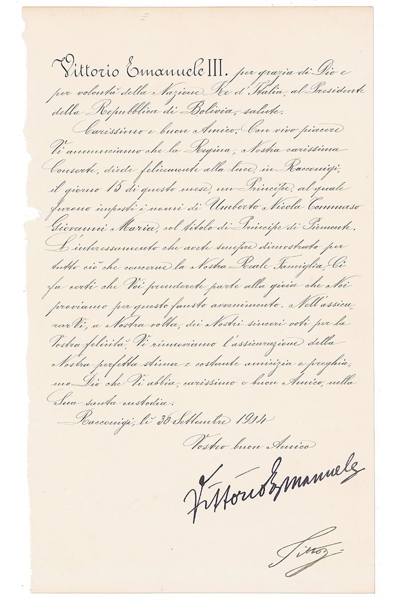 Manuscript DS, in Italian, signed “Vittorio Emanuele,” one page, 8.25 x 14, September 30, 1904. Letter of state to the president of Bolivia announcing the birth of his son, Umberto II. In fine condition, with slight paper loss to upper left edge.
