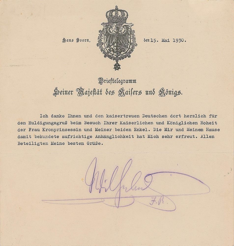 The last German Emperor and King of Prussia, (1859-1941) whose reign lasted from June 15, 1888, to November 9, 1918. DS in German, signed "Wilhelm F.R.," one page, 8.5 x 9, May 15, 1930. Official letter of greeting, in full (roughly translated): "I thank you and the Emperor-loyal Germans there warmly for the homage on your visit of your Imperial and Royal Highness the wife Crown Princess and My two grandchildren. The sincere devotion to Me and My Home has pleased Me very much. Best regards to all involved." In fine condition, with trimmed edges and an area of thin paper to the upper right corner.