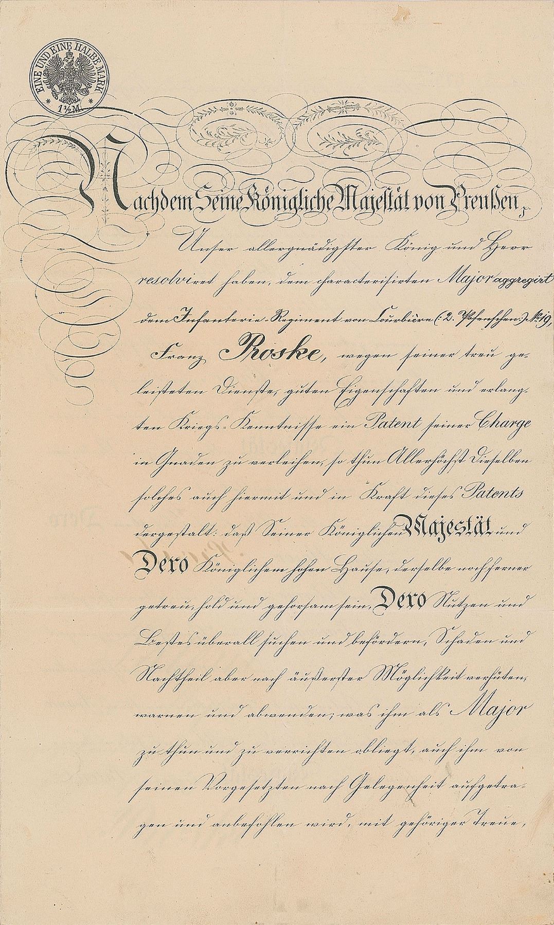 Manuscript DS in German, three pages on two adjoining sheets, 8.5 x 14.25, July 16, 1891. Official document concerning Franz Proske of the 2nd Posen Infantry Regiment of Courbiere. In very good to fine condition, with scattered creasing.