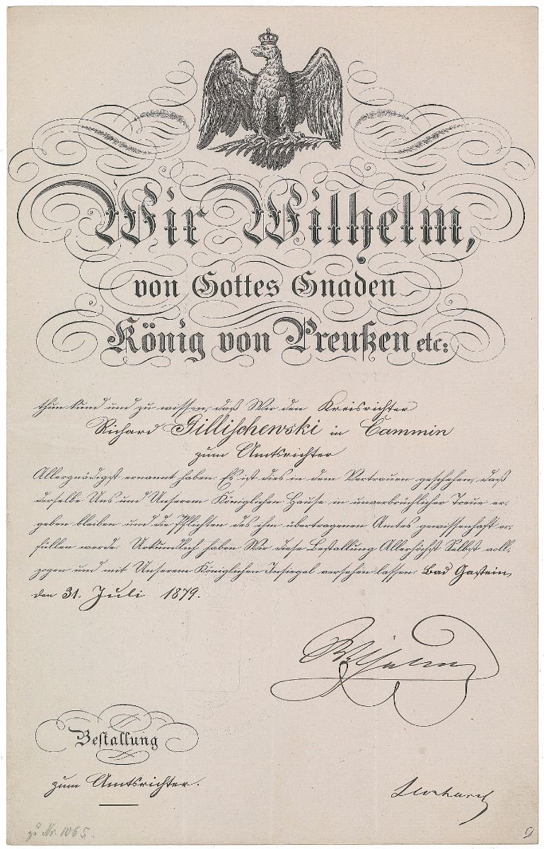 King of Prussia (born 1797) from 1861 and first emperor of Germany from 1871 until his death in 1888. Untranslated manuscript DS in German, signed “Wilhelm,” one page, 8.25 x 13, July 31, 1879. In fine condition.