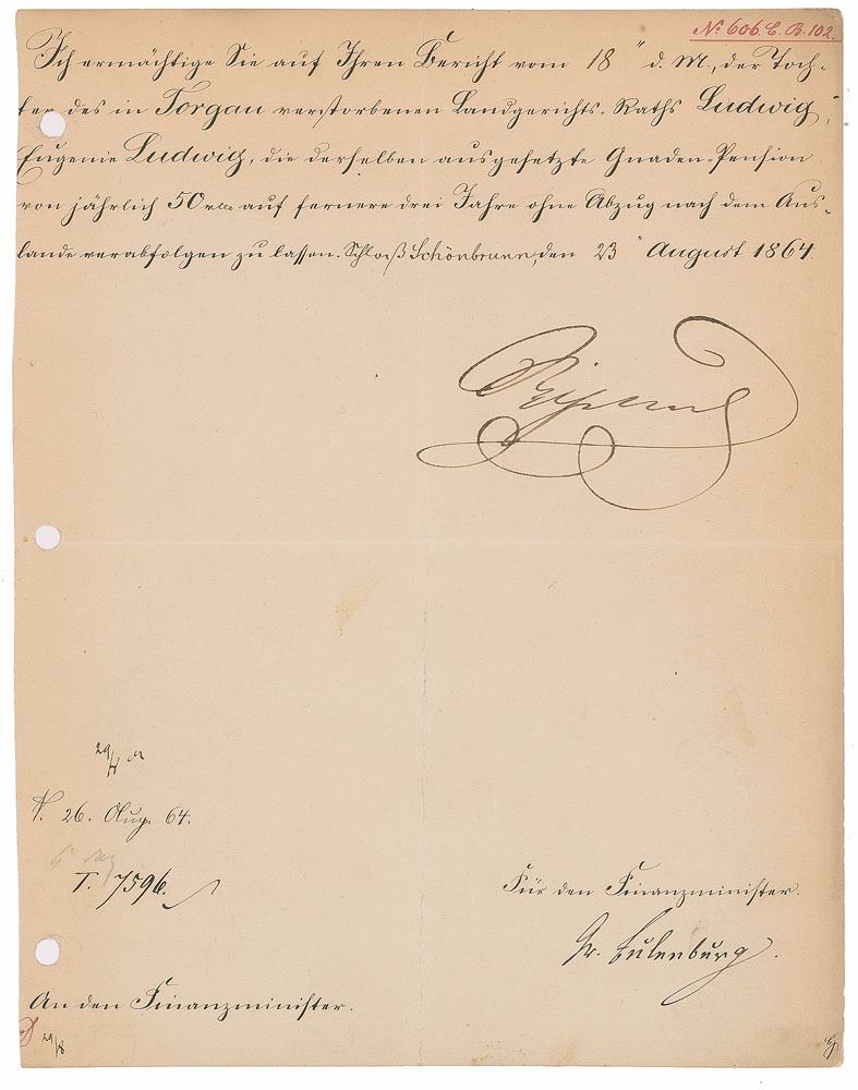 King of Prussia (born 1797) from 1861 and first emperor of Germany from 1871 until his death in 1888. Manuscript DS in German, signed “Wilhelm,” one page, 8.5 x 11, August 23, 1864. In part (roughly translated): "I assure you of your report of the 18th d. Ludwig, Eugenie Ludwig, the daughter of Torgau, deceased judge, the same suspended graces pension of annually 50 (Thaler) for further 3 years without departure to foreign countries to let adopt." Signed at the conclusion by Wilhelm, and countersigned by Finance Minister Botho zu Eulenburg. In fine condition, with trimmed edges, a short tear to the top edge, and three file holes to the left side.