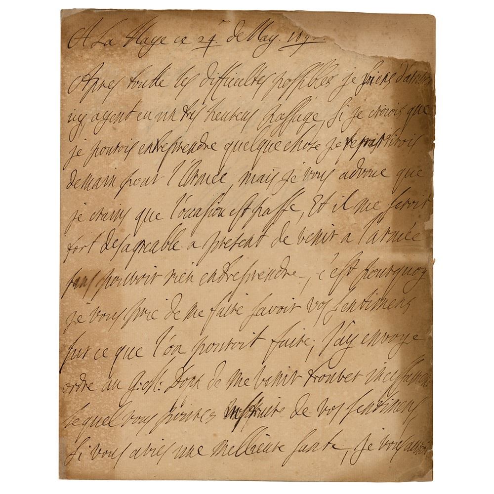 Sovereign Prince of Orange (1650"“1702) who served as King of England, Scotland, and Ireland from 1689 until his death. ALS in French, signed "William R," two pages on two adjoining sheets, 7 x 8.75, May 24, 169[?]. Handwritten letter from the Hague concerning a military campaign. In part (translated): "After all the possible difficulties I have just arrived having had a very good passage. If I believed that I could start something I would leave tomorrow to join the army but I do have to confess to you that I believe the occasion has now passed and it would be very disagreeable now to come to join the army without being able to achieve anything. And this is why I would ask you to let me know what you think could now be done. I have sent an order to the military governor of Dopp to come and see me. And I would also like your opinion of this"¦I would ask you to come and get around this place so that we can leave the troops correctly. I always hope I will have soon the great satisfaction of embracing you." In very good condition, with heavy irregular toning, and old restored areas of paper loss, primarily to the upper right corners.