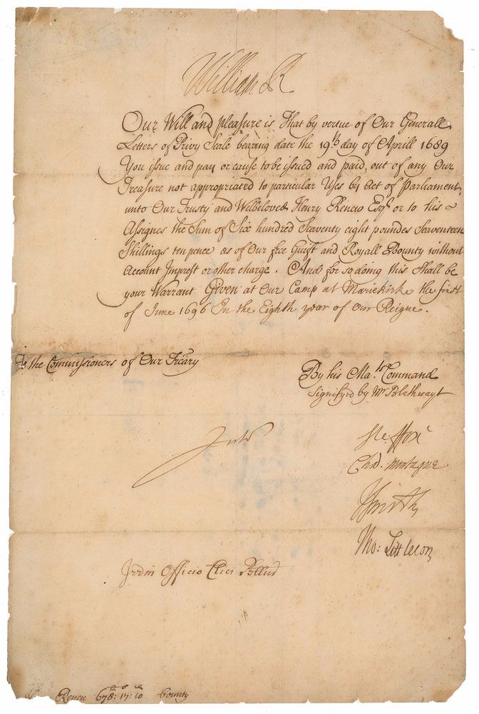 Sovereign Prince of Orange (1650–1702) who served as King of England, Scotland, and Ireland from 1689 until his death. Desirable manuscript DS, signed “William R,” one page, 8.75 x 13.5, June 1, 1696. Document issued to the commissioners of the Treasury, while "at Our Camp at Mariekirke," asking them "by vertue of our Generall Letters of Privy Seale bearing the date the 19th day of Aprill 1689…to pay…Our Trusty and Welbeloved Henry Renew Esqr." the sum of £678.17.10 "as of Our free Guift and Royall Bonuty without Account Imprest or other charge." Signed at the head by King William III, and at the conclusion by Stephen Fox, Charles Montagu, John Smith, and Thomas Littleton. In very good to fine condition, with archival reinforcements on the reverse. Henry Renew was a merchant who in 1699 appears as a Commissioner to take subscriptions for the Land Bank. This document was issued toward the end of the War of the Grand Alliance, in which William, as his own commander-in-chief, joined with Holland, Spain, the Holy Roman Empire, Sweden, Savoy, and other states to force Louis XIV back within his previous borders.
