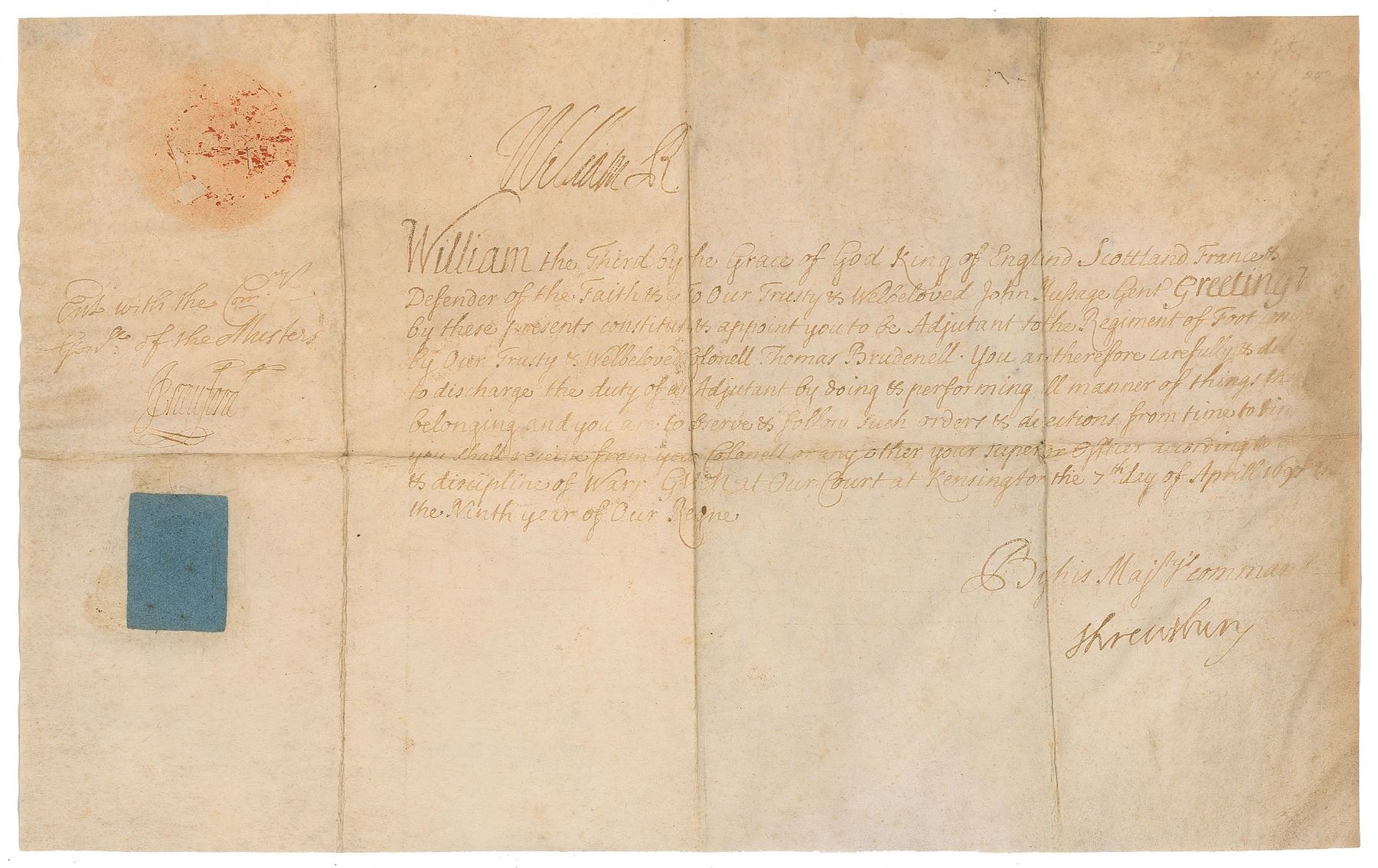 Manuscript vellum DS, signed “William R.,” one page, 13.5 x 8.5, April 7, 1697. King William appoints John Mussage to be "Adjutant to the Regiment of Foot…by our Trusty & Welbeloved Colonel Thomas Brudenell." Signed in the upper portion by the king, and countersigned in the lower right by Charles Talbot, 1st Duke of Shrewsbury. Lower left bears the original blue paper seal, with red wax seal no longer present. In very good condition, with overall rippling, missing seal, and staining to the top and right edges.