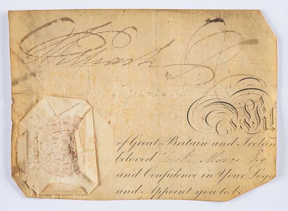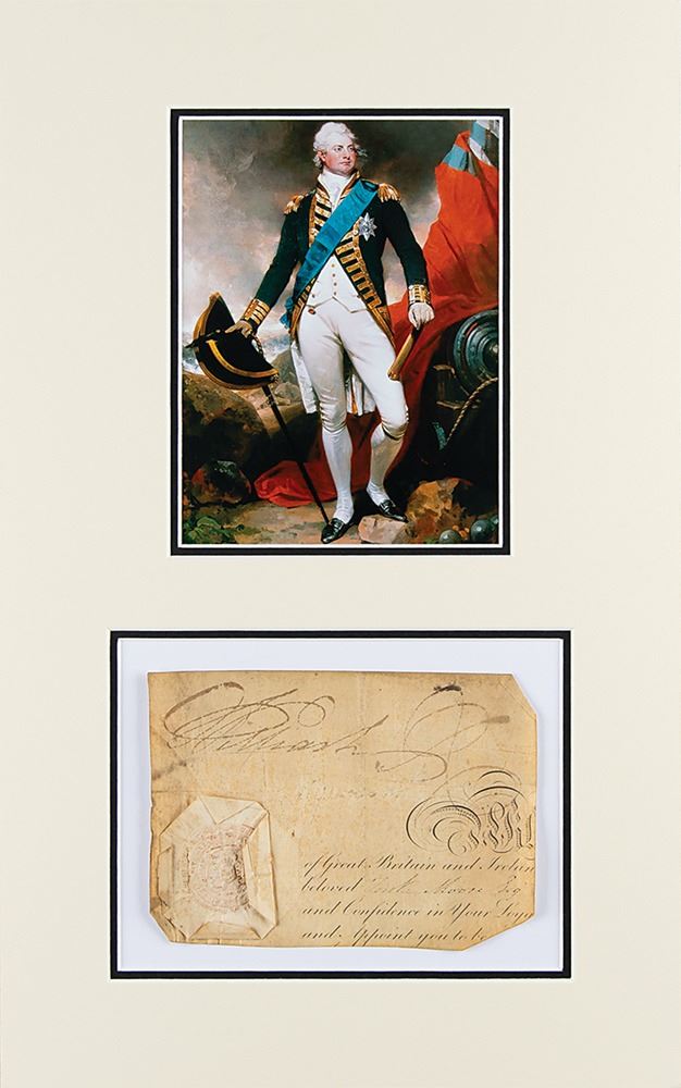 Large ink signature, "William R," on an off-white 7 x 5 slip clipped from a document, with the embossed paper seal intact. Mounted and double-matted with a portrait to an overall size of 12.25 x 19.5. In very good condition, with creasing, toning, and soiling.