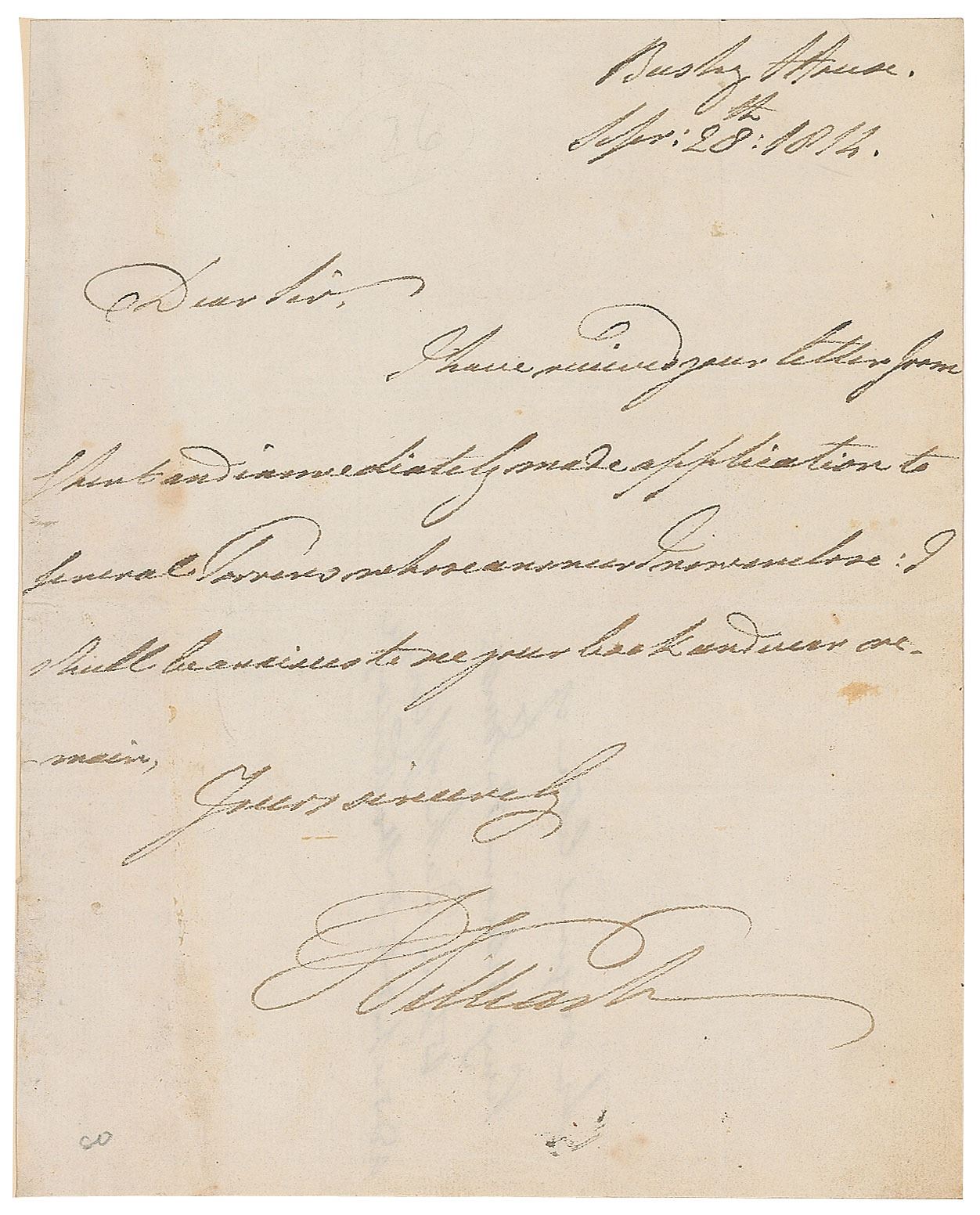 ALS as Duke of Clarence and St. Andrews, signed “William,” one page, 7.5 x 9.25, September 28, 1814. Letter to Dr. Andrew Halliday, in part: "I have received your letter…and immediately made application to General Torres…I shall be anxious to see your book." In fine condition, with an old mounting strip along the back of the left edge.