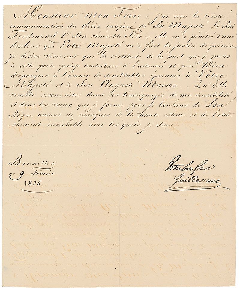 Prince of Orange who, feeling threatened by Napoleon, proclaimed the Netherlands as his kingdom at the urging of the powers gathered at the Congress of Vienna (1772–1843). LS in French, signed “Votre bon frere, Guillaume,” one page, 7.75 x 9.5, February 9, 1825. Untranslated letter in which William writes to Francis I, who had just been crowned as King of the Two Sicilies, expressing condolences on the unexpected death of his father, Ferdinand I. In fine condition, with central vertical and horizontal folds and mild mirroring to ink. Accompanied by the original transmittal envelope.