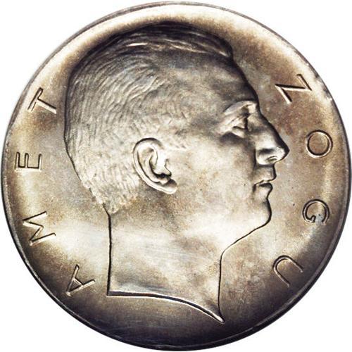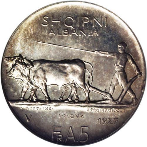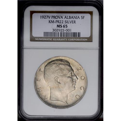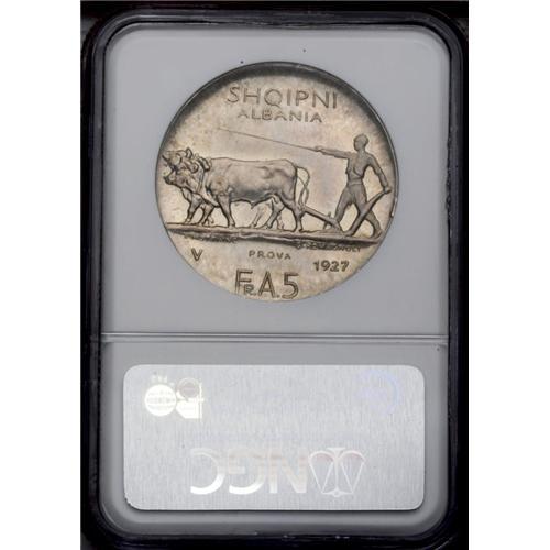 King Zog I Prova 5 Franga Ari 1927V, KM-PR22, MS65 NGC. King Zog I Prova 5 Franga Ari 1927V,