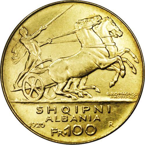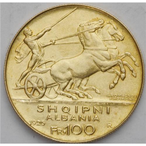 King Zog I gold 100 Franga Ari 1926R, two stars below b King Zog I gold 100 Franga Ari 1926R,