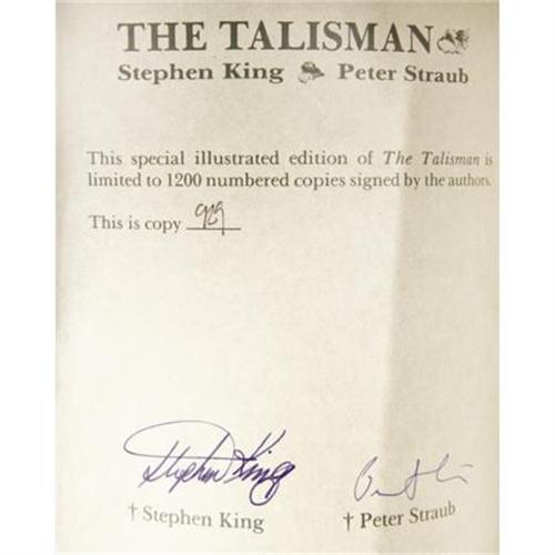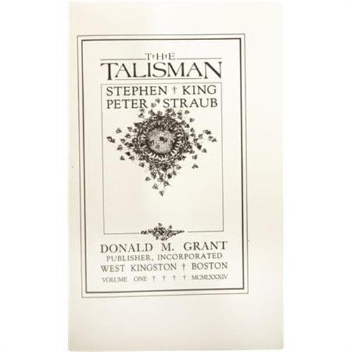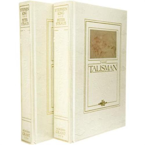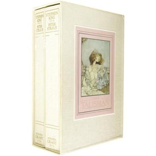 <B>Stephen King and Peter Straub Limited Signed: </B></I><B><I>The Talisman</B></I></B></I>. (West Kingston, RI: Donald M. Grant, 1984), in two volumes, first edition limited to 1200 numbered signed copies of which this is copy number 929, 463 and 334 pages respectively, signed by both authors on a special limitation page bound in front, color illustrations, beige cloth with decoration in blind, gilt titles and rules and a small color pastedown mounted on each cover, pictorial endpapers, 8vo (6.25” x 9.25”), about fine in a matching slipcase with pastedown illustration, in very good condition.<BR><BR><b>Shipping:</b> Books & Catalogs (<a target="_blank" href="http://www.heritageauctions.com/common/shipping.php">view shipping information</a>)