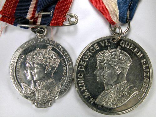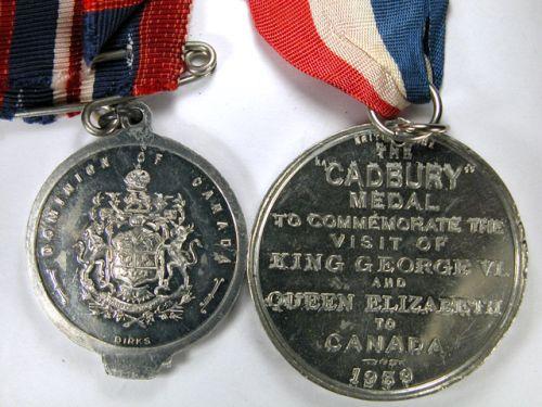 King George VI and Queen Elizabeth - 1939 Visit to Canada, two Suspended Medals, one with Dominion of Canada, Birks on reverse, and the other with The Cadbury Medal on the reverse