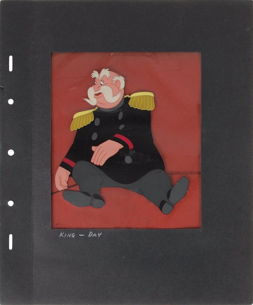 (Walt Disney Studios, 1950) Original production cel from Cinderella, depicting the temperamental king in a seated position and wearing a black suit with gold epaulettes. White artist’s pencil on original animation mat reads, “King—Day.” Image measures 5.25 x 5.75, with a mat opening of 5.75 x 7. Mat dimensions are 10 x 12. In fine condition, with some wear to mat.