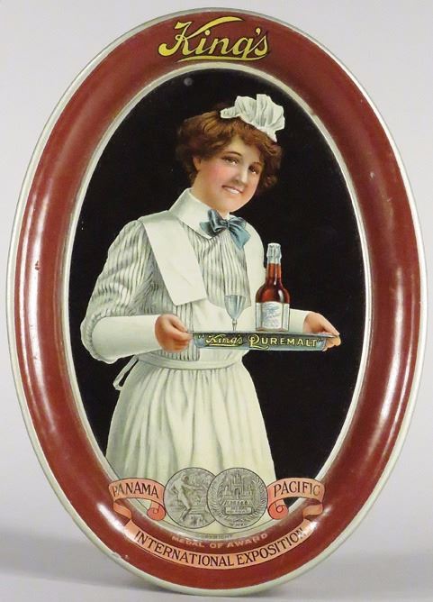 King's Pure Malt Tin Tip Tray. Panama Pacific International Exposition. Minor edgewear otherwise excellent condition. 4 1/4 X 6 inches.