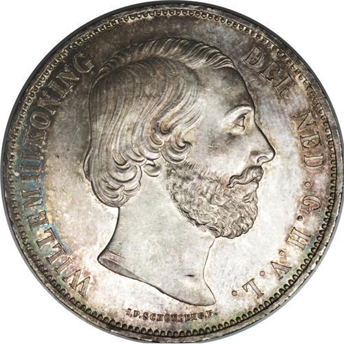 <B>Kingdom. Willem III 2 1/2 Gulden 1870, </B></I>KM82, choice UNC with spectacular multi-hued toning and flashy surfaces - just an incredible coin with instant eye appeal.