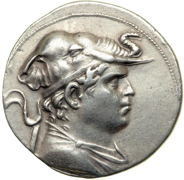 Kingdom of Baktria. Demetrios I, c. 200-185 BC. AR Tetradrachm (16.85 g). Draped bust right of Demetrios I, wearing elephant headdress. Reverse: Herakles holding club and lion's skin. Bopear. Série 1F; SNG ANS 192. Very rare this choice and of good metal; Very Fine to Extremely Fine. .