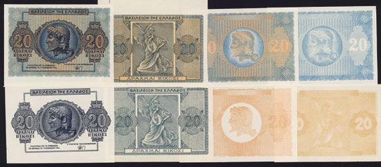 Greece, 1944. 20 Drachmai, P-323 Unlisted, Lot of 8 pieces, Lot includes various progress proofs and specimens. AU to CU condition. Rare and attractive Inflation era progress proofs by Greek local printer. (8 notes total).
