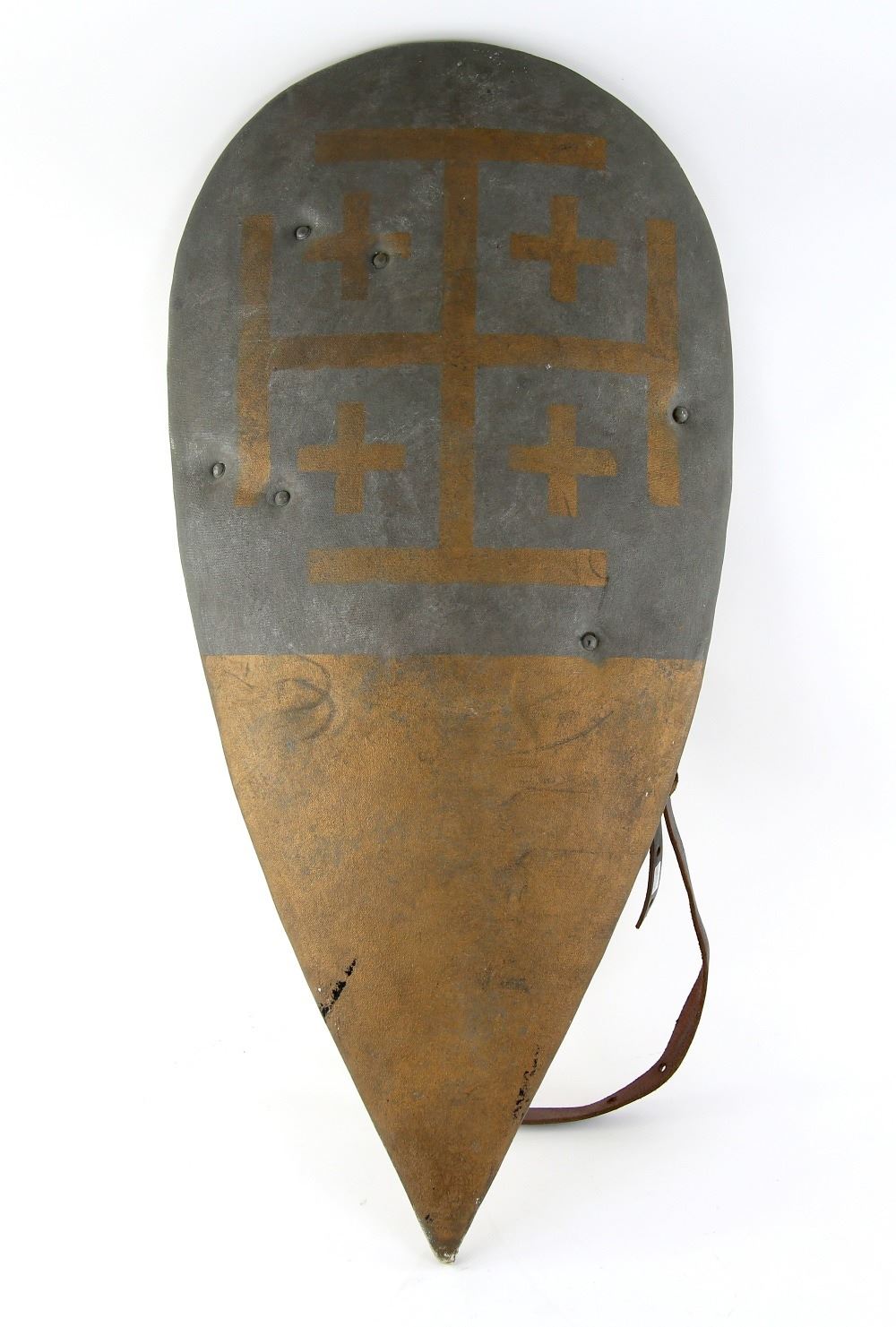 Kingdom of Heaven (2005) A prop shield used by soldiers of Jerusalem in the Ridley Scott epic movie starring Orlando Bloom. Used for the scenes in which Jerusalem's army goes on its march to war against Saladin across the open desert. The shield is made of canvas with leather strapping on the rear to allow it to be carried on the arm and slung on a cavalryman’s back. Painted front in the colours of the city of Jerusalem. 42 x 8 x 92cm.