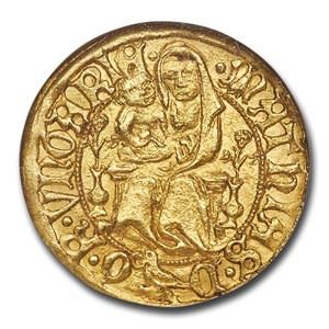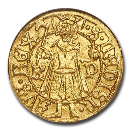 This Goldgulden from Hungary is roughly of the same weight of the Gold Ducat of Venice. Many imitative coins where struck following the Gold Ducat size for its readily acceptance in Medieval trade. Struck duringbetween 1458-1490 AD under the reign of Matthias Corvinus.