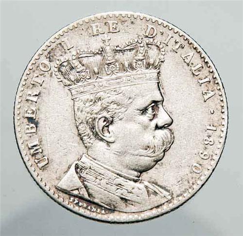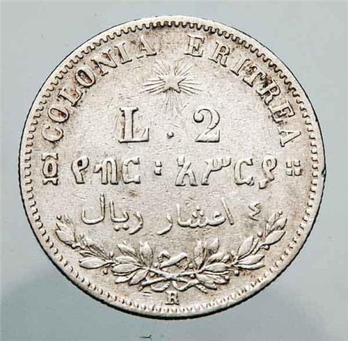 Regno d'Italia - Umberto I (1878-1900) - Colonie - Eritrea - 2 Lire 1890 - Metallo: Ag - Zecca: Roma - Diritto: effigie coronata del Re a destra - Rovescio: valore e leggenda trilingue fra stella e rami di alloro -
