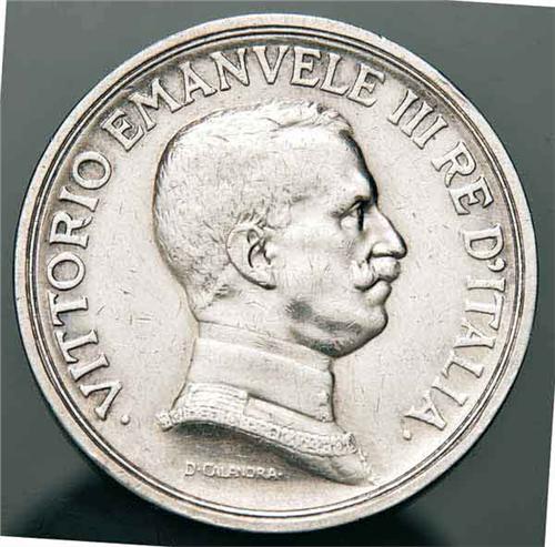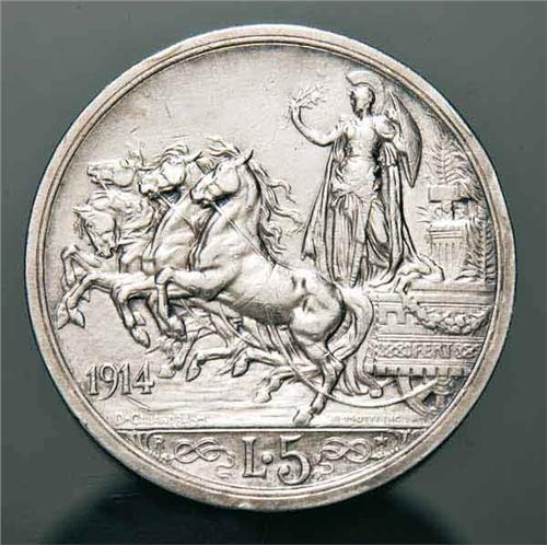 Regno d'Italia - Vittorio Emanuele III (1900-1946) - 5 Lire Quadriga Briosas 1914 - Metallo: Ag - Zecca: Roma - Diritto: effigie del Re a destra - Rovescio: l'Italia elmata con scudo e ramo d'ulivo ritta su quadriga briosa a sinistra - Qualche colpetto ai bordi