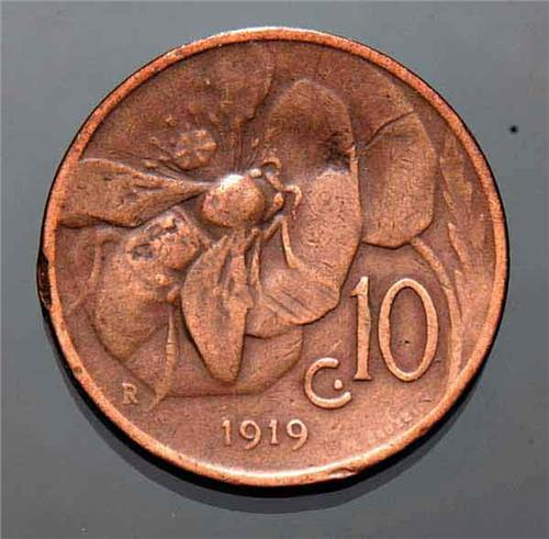 Regno d'Italia - Vittorio Emanuele III (1900-1946) - 10 Centesipi Ape 1919 - Metallo: Cu - Zecca: Roma - Diritto: effigie del re a sinistra - Rovescio: ape su fiore - Da esaminare