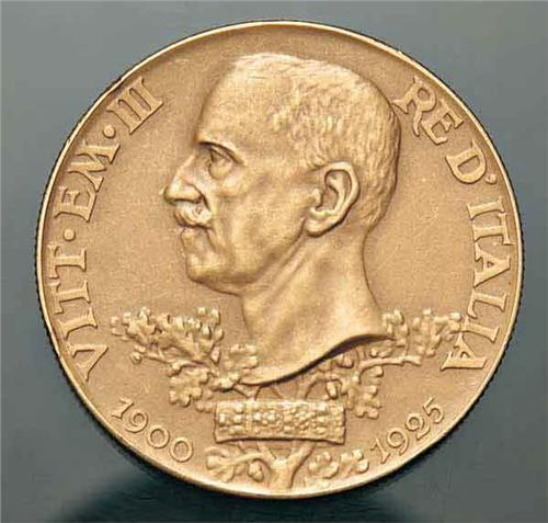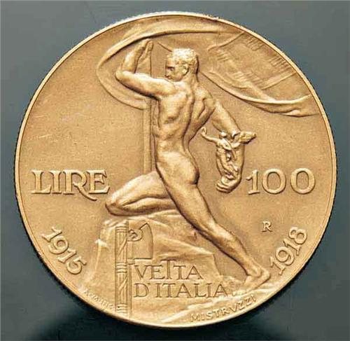 Regno d'Italia - Vittorio Emanuele III (1900-1946) - 100 Lire Vetta d'Italia 1925 - Metallo: Au - Zecca: Roma - Diritto: effigie del Re a sinistra - Rovescio: figura maschile nuda con bandiera, recante lo stemma sabaudo, e vittoriola -