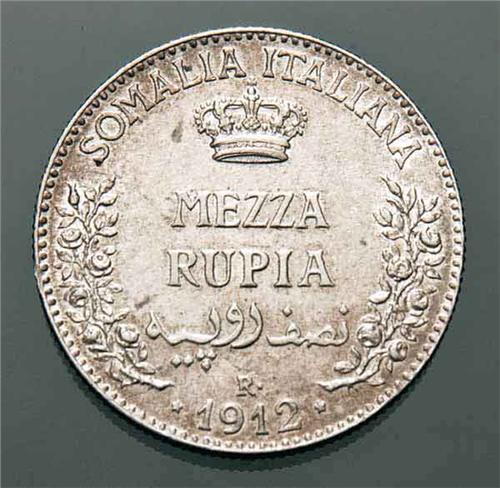 Regno d'Italia - Vittorio Emanuele III (1900-1946) - Colonie - Somalia - Meza Rupia 1912 - Metallo: Ag - Zecca: Roma - Diritto: effigie del Re a destra - Rovescio: corona e valore bilingue entro due rami di rosa - Di ottima qualità