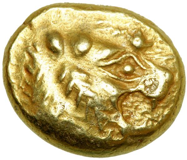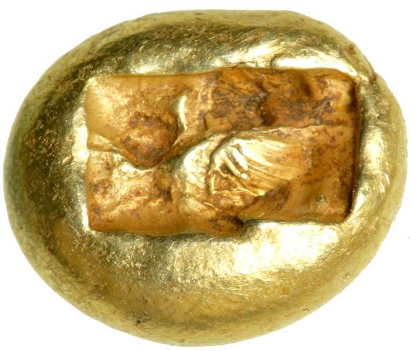 One of the earlier electrum pieces to portray an animal. Electrum is a native mixture of silver and gold, and found in the alluvial streambeds of Asia Minor, where coinage began .